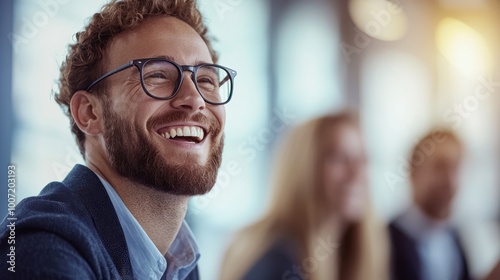 Cheerful man with glasses smiling in a meeting, soft focus background, professional setting.