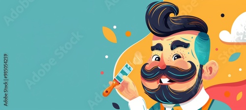 moustache, grooming, cartoon, character, advertisement, cheerful, comb, wax, colourful, blithe, vintage, design, print, card, poster, fun, banner, bright, playful, whimsical, retro, barber, humor, facial hair, illustration, advertising, artwork, promotional, style, male, accessory, product, maintenance, animate, background, personality, brush, man, wavy, leaf, cloud, orange, blue, graphic