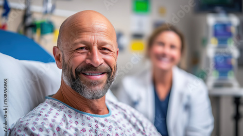 Cheerful patient with beard sitting on hospital bed smiling at camera while nurse stands in background with medical equipment in bright hospital room