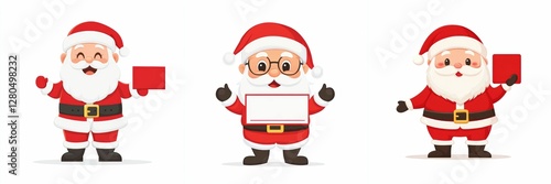Cheerful Santa Claus Characters Holding Signs Festive Holiday Season Celebrations Graphic Illustrations