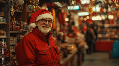cheerful, shopkeeper, santa, dressed, decorated, upscale, holiday, market, smile, retail, joyful, festive, atmosphere, portrait, seasonal, client, seller, service, beard, hat, red, winter, gift, tradition, community, entrance, cosy, local, store, background