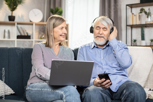 Cheerful senior pair having fun on comfortable sofa using modern laptop for watching comedy show in stylish living room. Smiling woman adjusting wireless earphones for beloved husband.