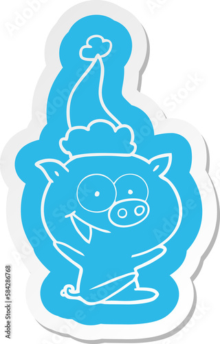 cheerful sitting pig cartoon sticker of a wearing santa hat