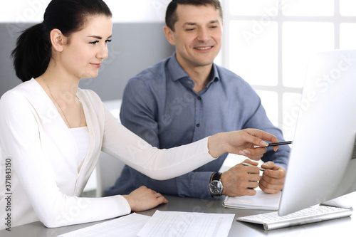 Cheerful smiling businessman and woman working with computer in modern office. Headshot at meeting or workplace. Teamwork, partnership and business concept