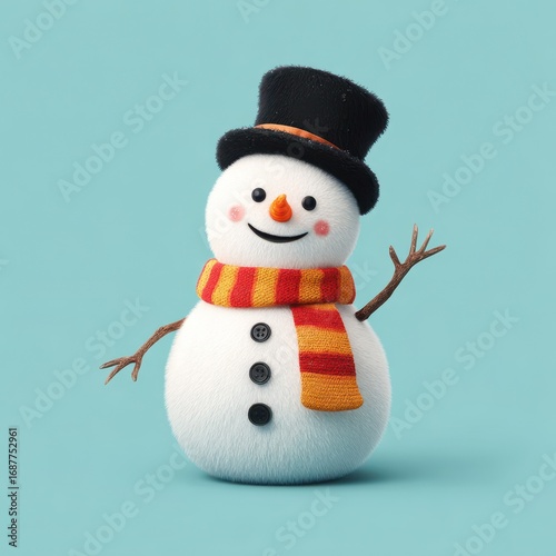 snowman, winter, hat, foulard, cheerful, waving, festive, cold, blue background, decoration, holiday, cute, character, snow, frosty, fun, playful, seasonal, happy, smile, friendly, warmth, joyful, design, whimsical, bright, colourful, animation, creativity, holiday spirit, family, snowy, winter landscape, smiling, happiness, craftsmanship, storytelling, tradition, joy, welcoming, nostalgia
