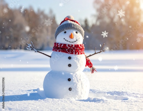 Cheerful snowman with red scarf and hat in a snowy winter scene