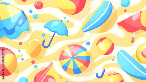 cheerful summer inspired pattern featuring colorful beach balls, umbrellas, and surfboards on bright yellow background, evoking fun and vibrant atmosphere