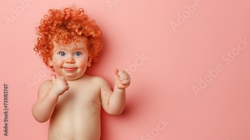 Cheerful toddler giving a thumbs up on pastel background, leaving ample space for text placement.