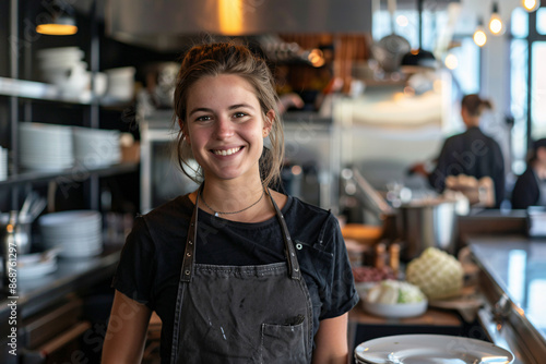 waitress, smiling, kitchen, eatery, female, apron, plate, cheerful, professional, work, food, preparation, background, shelf, dish, light, modern, culinary, teamwork, young, happy, counter, service, hospitality, uniform, utensil, workspace, cooking, casual attire, industry, co-worker, tableware, stainless steel, indoor, culinary arts, energy, atmosphere, working, workplace, bustling, cafes, person, smile, woman, bar, beauty