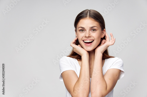 Cheerful woman smile white t-shirt straightens her hair