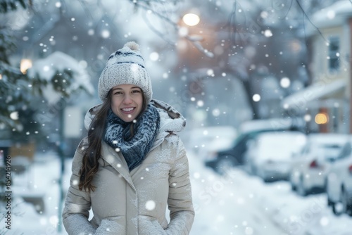 woman, snowfall, quaint, town, snowflake, cheerful, winter, joy, beauty, fashion, cold, style, nature, contemporary, smile, female, young, charming, casual attire, holiday, contentment, enjoyment, seasonal, peaceful, cold weather, frosty, relaxation, leisure, stylish, winter fashion, natural beauty, happiness, foulard, coat, bliss, cosy, picturesque, winter scene
