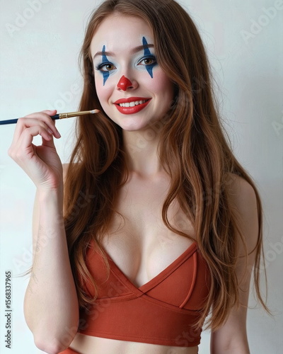Cheerful woman with vibrant clown makeup and a playful smile, holding a brush, ideal for party, event, and entertainment promotions