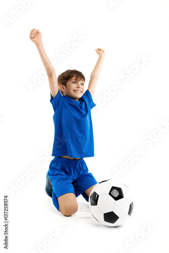 Cheerful young boy soccer player, in blue sport outfit celebrate winning over white background