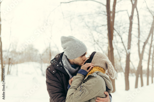 Cheerful young couple walking in a winter day