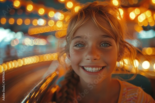 smile, carousel, girl, light, bright, cheerful, happiness, joy, children, amusement, fun, carefree, evening, youthful, playful, innocence, amusement park, excitement, ride, entertainment, childhood, carnival, freckle, summer, leisure, enjoyment, recreation, fairground, delight, vibrant, youth, festive, atmosphere, festivity, personality