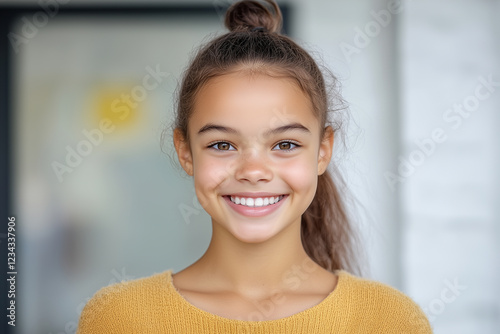 Cheerful young girl with ponytail smiles brightly in casual outfit