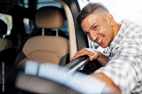 car, dealership, man, purchase, smile, looking, photogenic, new, guy, transportation, male, young, owner, people, sale, successful, transport, vehicle, happy, retail, rental, buyer, automobile, auto, caucasian, choosing, cheerful, client