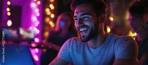 cheerful, young, man, online, gaming, friends, evening, gathering, gym, colourful, light, laughter, excitement, fun, social, entertainment, activity, happiness, joy, sport, group, technology, play, competition, leisure, nightlife, interaction, digital, connection, mood, celebration, casual attire, tournament, teamwork, vibe, atmosphere, virtual, headset, scene, camaraderie, energy, life events, thrill, friendship, enjoyment, engagement