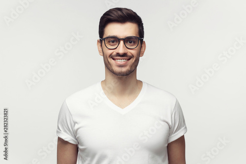 Cheerful young man in white t-shirt looking at camera, isolated on gray background