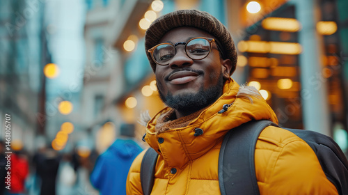 man, city, street, cheerful, young, adult, male, yellow, jacket, goggles, winter, urban, fashion, happy, smile, beanie, backpack, travel, modern, stylish, confident, african, black, cold, casual attire, trendy, lifestyle, person, holiday maker, autumn, day, people, walking, blurred, background, building, downtown, metropolitan, photogenic, joyful, looking, positive, energetic, city landscape