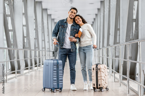 Cheerful Young Middle Eastern Couple Standing At Airport With Luggage And Smartphone