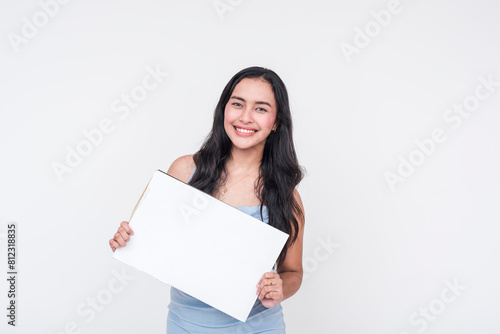 female, woman, blank sign, pointing, isolated on white, enthusiastic, young, lady, advertisement, white background, happy, cheerful, smile, presentation, copy space, casual attire, marketing, engaging, blithe, attractive, model, portrait, friendly, informative, vertical, gesture, welcoming, eye contact, advertising, communicative, promotional, single person, directing, filipina, filipino, thai, indonesian, malaysian, vietnamese, advertisement
