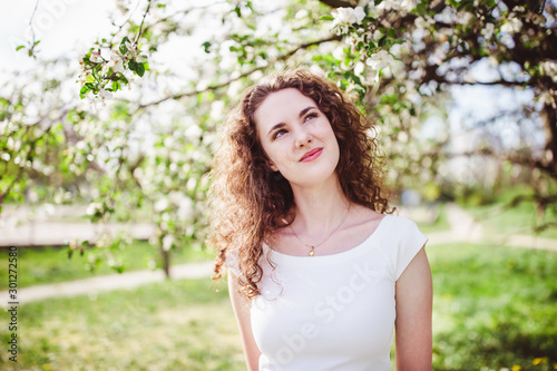Cheerful young woman in a white t-shirt under the blooming tree.