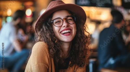 Cheerful Young Woman in Hat and Glasses Laughing with Friends at Coffee Shop
