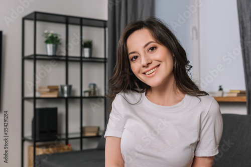 cheerful young woman looking at camera in living room