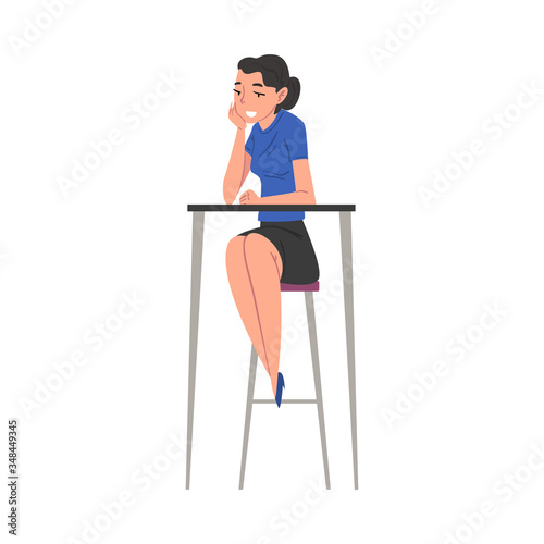 Cheerful Young Woman Sitting on High Chair at Desk, HR Specialist Working at Headhunting Agency Vector Illustration