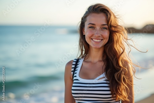 Cheerful Young Woman Smiling at Sunset by the Ocean, Radiating Joy and Confidence in a Striped Top with Natural Beach Backdrop