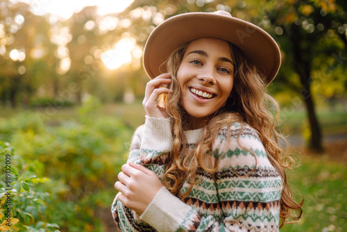 Cheerful young woman wearing a sweater and hat enjoys a sunny autumn day in a park filled with colorful foliage. Autumn woman.