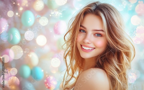 Cheerful young woman with long, shiny hair and a radiant expression, with pastel-colored Easter eggs softly blurred in the background