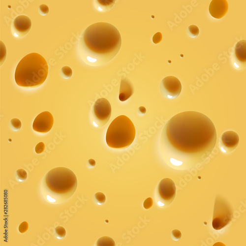 Cheese background with holes of various shapes and depths. 3D vector. High detailed realistic illustration.