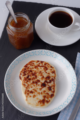 breakfast, cheese, jam, sweet, hot drink, black coffee, cup, coffee cup, food, meal, snack, plate, slate, black, indoor, interior, teaspoon, blue, prepared, studio shot, nobody, portion