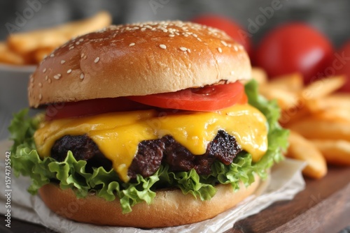 Cheeseburger with lettuce and tomato.
