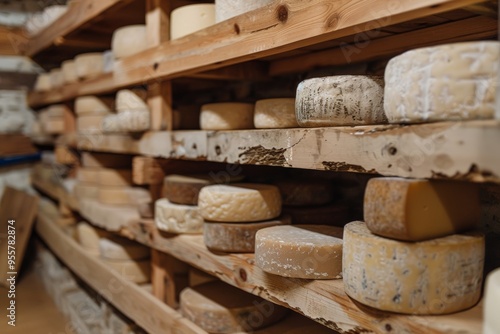 Cheeses aging on wooden shelves in a rustic cellar setting showcasing traditional cheese-making practices
