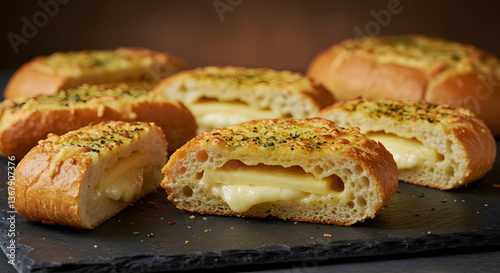 Cheesy Garlic Bread with Melted Mozzarella and Herbs on Black Slate – Crispy and Buttery Toasted Bread with Stretchy Cheese – Delicious Appetizer, Side Dish, or Savory Snack for Food Lovers