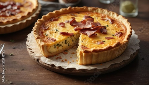 Cheesy quiche with smoked bacon and a golden crust, baked goods, kitchen table centerpiece