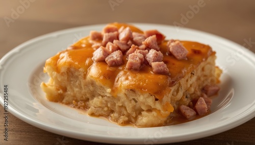 ham, casserole, cheese, food, plate, meal, dish, sauce, baked, baking, potato, horizontal, creamy, pan