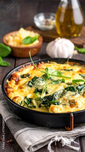 spinach, cheese, bake, casserole, dish, food, meal, dinner, lunch, table, wood, rustic, homemade, tasty, delicious, healthy, vegetarian, ingredient, garlic, olive, oil, herb, green, yellow, brown, oven, pan, plate, nourish, culinary