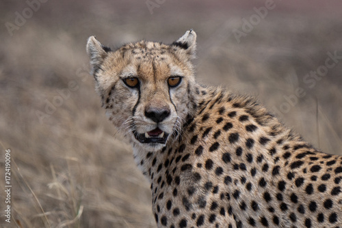 Cheetah intense portrait in African savannah showing classic black tear marks