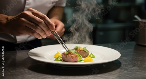 chef, food, kitchen, epicure, plating, eatery, cooking, meal, fine dining, preparation, dish, steam, culinary, garnish, professional, tweezer, hot, meat, sauce, art, cookery, gastronomy, hand, fresh, service, dinner, luxury, skill