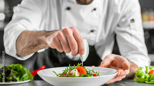 chef, food, salad, eatery, cooking, kitchen, dining, garnish, dressing, sauce, delicious, fresh, healthy, epicure, vegetable, plate, tomatoes, greener, meal, culinary, prepare, hand, professional, kitchen utensile, ingredient, food photography