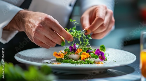 Chef decorates a beautifully presented dish with small herbs and flowers