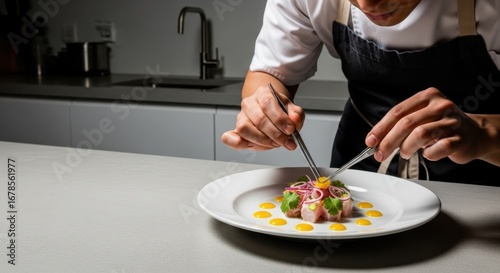 chef, plating, food, dish, seafood, kitchen, eatery, cookery, epicure, culinary, preparation, ingredient, skill, professional, tweezer, cook, meal, dining, fine, art, presentation, delicious, receipe, gastronomy, plate, table, service, expert, tasty, fresh, healthy, nourishment, diet, salmon, tuna, shrimp, lobster, crab, fish, squid