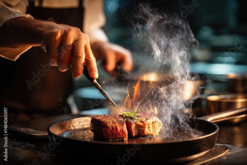 Chef expertly sears a succulent steak in a cast iron pan, flames dancing around the sizzling meat. The rich aroma and smoke add to the dramatic scene.