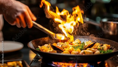 chef, cooking, food, eatery, kitchen, fire, flames, seafood, mussel, scallop, pan, dish, meal, dinner, lunch, cookery, culinary, epicure, professional, heat, flames, delicious, tasty, healthy, fresh, ingredient, preparation, skill, technique, gastronomy, culinary arts, receipe, menu, service, hospitality, catering, nourishment, diet, lifestyle, eating, hunger