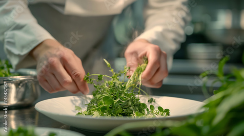 chef, garnishing, fresh, herb, cookery, presentation, plating, epicure, food, professional, kitchen, culinary, art, fine, dining, greenery, eatery, cooking, gastronomy, meal, preparation, skill, creative, uniform, healthy, ingredient, attention, detail, styling, counter, steel, pot, precision, white, artistic, work, expertise, artistry, produce, life events, favor, craft, elegant, kitchen utensile, refined, technique, hospitality