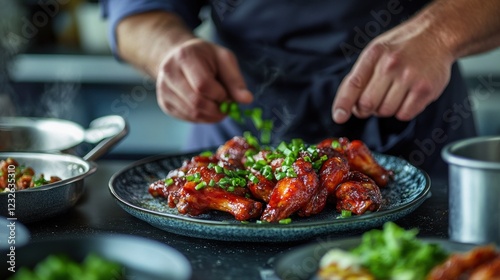 chef, cooking, food, chicken, wing, bar-b-q, sauce, garnish, plate, kitchen, hand, delicious, tasty, appetising, eatery, meal, dinner, lunch, dinner, epicure, cookery, receipe, glaze, savoury, meat, poultry, protein, hot, steam, spice, herb, green, onion, preparation, culinary, professional, catering, platter, serving, presentation, healthy, fresh